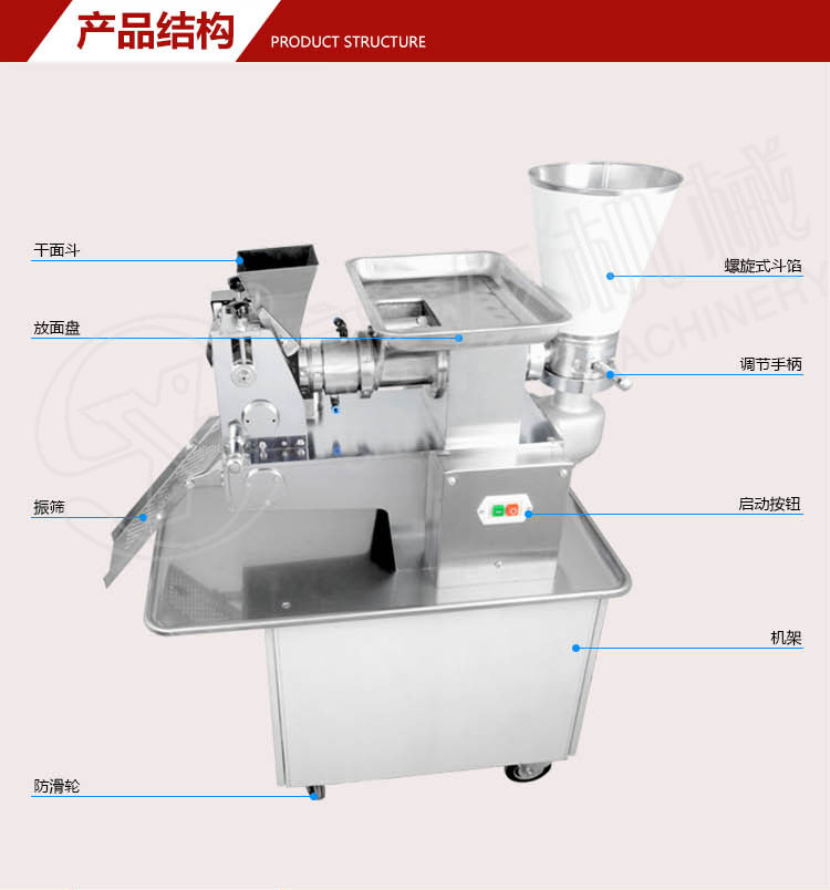 2. 面皮厚度与馅量可调整。 3. 适合多种调理: 包制出来的饺子可蒸、煮、炸、煎。春卷与咖喱角与咖喱卜油炸尤其可口。最重要的是均适合急速冷冻、耐贮藏,是理想的微波炉食品。 4. 操作简便省时省力: 人工制造饺子、春卷、锅贴、咖喱卜、咖喱角,耗时费工,尤其目前在劳工严重缺乏的情形下,更是令大多数的老板烦恼不已,这台机械操作简便,无经验者也可操作。制造速度快,不但省时而且省力。 5. 完美的设计,同时兼顾卫生与美观两大优点。 6. 拆装容易、清洗简便。 7. 结构精巧占地小: 机械尺寸: 990(长)×470(宽)×1150(高)毫米。重量:150公斤。 8. 产量高: 饺子:3,000-6,000个/时 春卷:1,500-3,000个/时 锅贴:2,000-4,000个/时 咖喱饺:2,000-5,000个/时 SY-JZJ系列饺子自动成型机,本机适用于宾馆、饭店、餐厅、团体食堂加工、幼儿园、速冻饺子生产。各种肉馅、肉菜混合馅、全菜馅及其它种馅的饺子。 |
